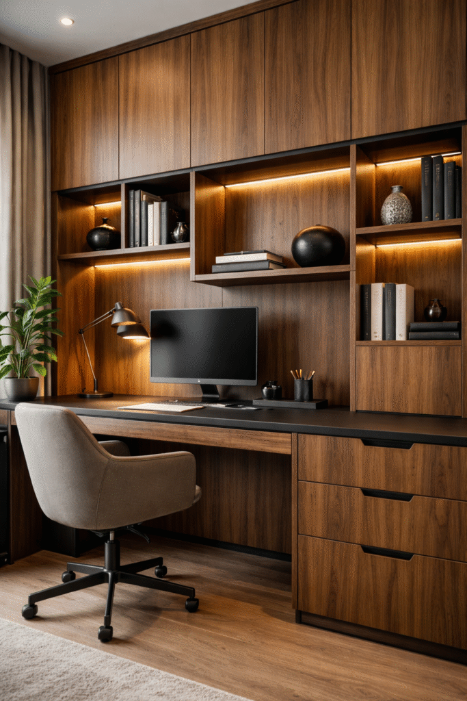 Zabudowa na wymiar zaprojektowana dla osoby zarządzającej. naturalne drewno, precyzyjne detale i subtelne oświetlenie LED tworzą przestrzeń sprzyjającą koncentracji i podejmowaniu kluczowych decyzji