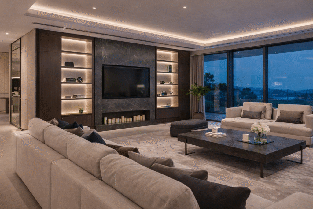 Detal nowoczesnej zabudowy na wymiar, łączącej kamień o wyrazistej strukturze z ultra-matowymi frontami i zintegrowanym oświetleniem LED. Subtelna linia światła podkreśla precyzję wykonania i architektoniczny charakter wnętrza.