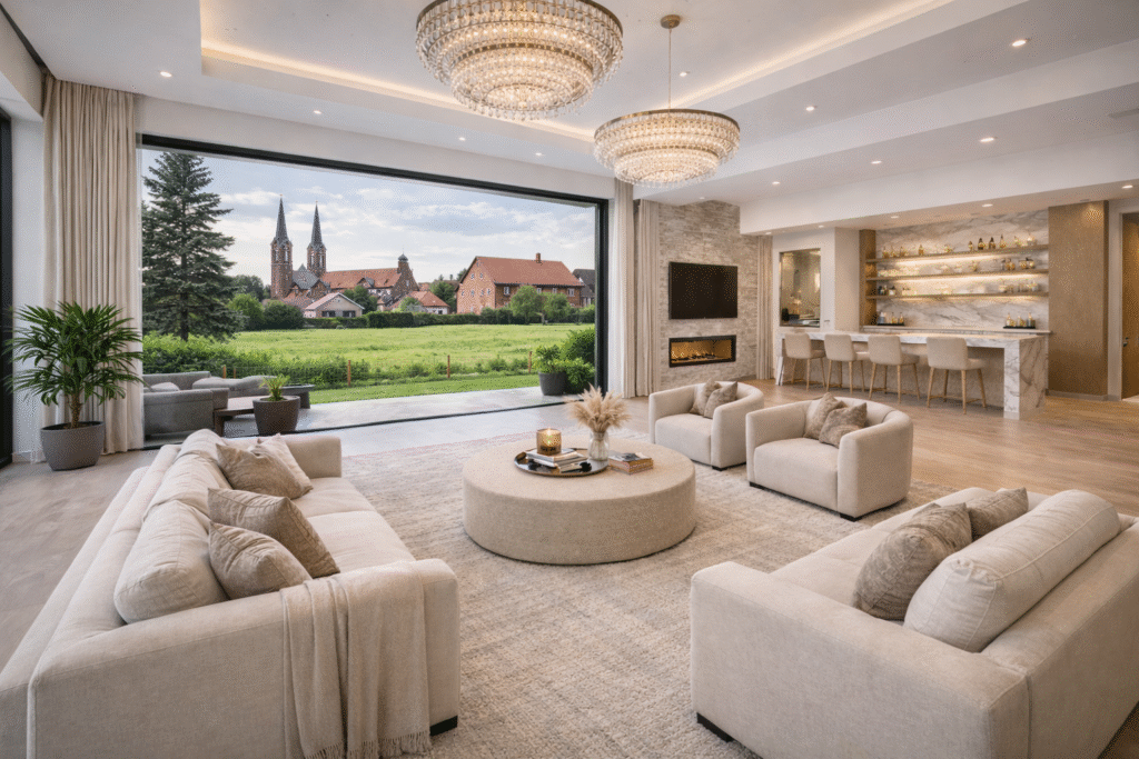 Nowoczesna willa z przestronnym salonem i kuchnią na wymiar, zaprojektowana z myślą o komforcie i ponadczasowej elegancji. Centralnym elementem wnętrza jest kuchnia wykonana na zamówienie – z naturalnych materiałów, kamienną wyspą oraz zabudową dopasowaną do architektury przestrzeni. Otwarta strefa dzienna łączy funkcjonalność z estetyką premium. Jasna kolorystyka, duże przeszklenia i precyzyjnie zaprojektowana zabudowa meblowa tworzą spójną, reprezentacyjną całość.