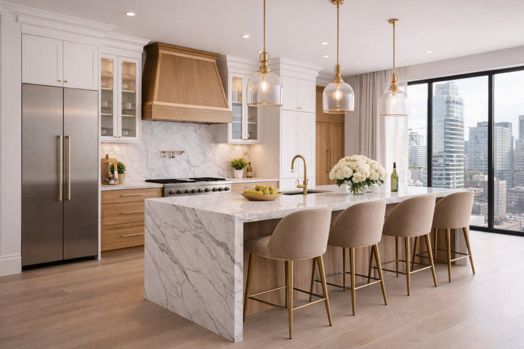 Nowoczesna kuchnia zaprojektowana i wykonana na wymiar, z myślą o eleganckim apartamencie. Zabudowa od podłogi do sufitu łączy lakierowane, jasne fronty z naturalnym drewnem, tworząc ponadczasową i spójną kompozycję. Centralnym punktem wnętrza jest wyspa z blatem z naturalnego kamienia w formie waterfall, pełniąca funkcję roboczą i reprezentacyjną. Sprzęt AGD, w tym lodówka w pełnej zabudowie, został dyskretnie zintegrowany z meblami. Całość dopełniają złote detale, dekoracyjne oświetlenie oraz duże przeszklenia, które podkreślają luksusowy charakter wnętrza.
