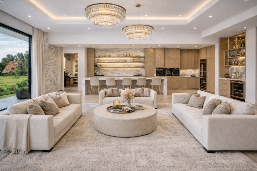 Ten imponujący salon z otwartą kuchnią to przykład wnętrza, w którym funkcjonalność spotyka luksusową estetykę. Centralnym punktem przestrzeni jest kuchnia – zaprojektowana jako serce domu, naturalnie łączące strefę dzienną z częścią reprezentacyjną. Zabudowa wykonana z wysokiej jakości materiałów, z kamienną wyspą i funkcjonalnym układem dopasowanym do wnętrza premium. Projekt łączy elegancję, ergonomię i indywidualne podejście do detalu.